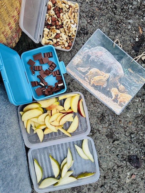 Dann fanden wir einen Jutesack, der gefüllt mit Leckereien für die Tiere war. Die Kinder durften sich ein Versteck für ihre Geschenke für die Tiere suchen. Manche jedoch schnabulieren die Nüsse gleich selbst.